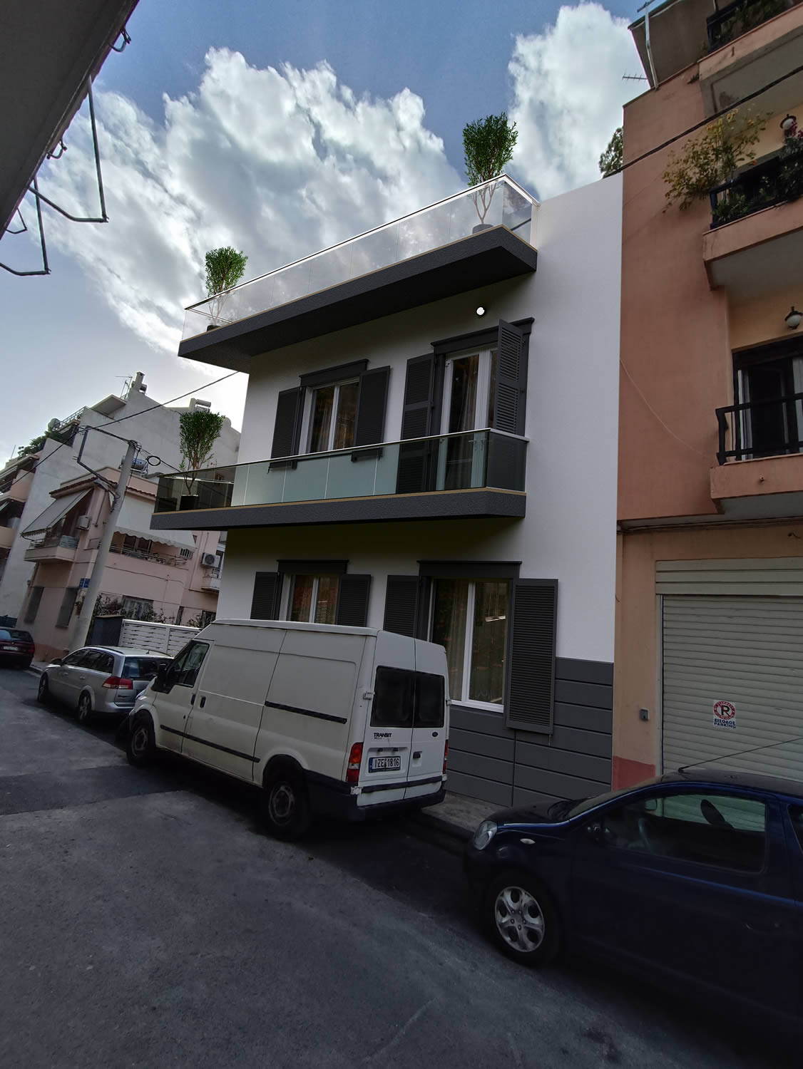 Akadimias project consists of a boutique building with two floors, originally comprising two large units of 150 square meters each. These have been divided into four luxury apartments designed with architectural sophistication.
